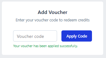 In the Add Voucher area, enter your voucher code and click Apply Code. (Note: Voucher codes consist of 10 characters, including uppercase letters and numbers.)