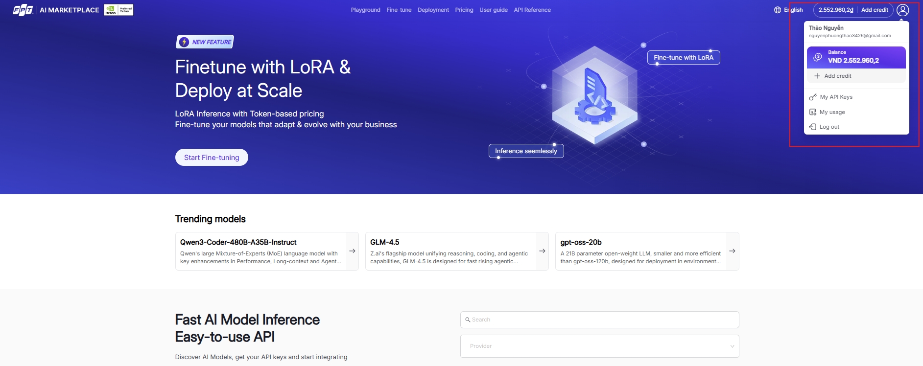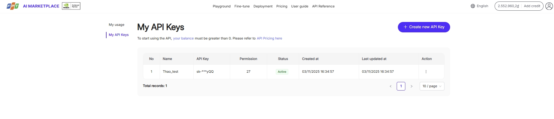 APIキーを作成するには、以下の手順に従ってください: ステップ1: 「マイAPIキー」ページに移動し、「新しいAPIキーを作成」ボタンをクリックします。 ステップ2: 名前を入力します ステップ3:アクセスしたいモデルを選択してください。 ステップ4: 「作成」ボタンをクリックして新しいAPIキーを生成します。
