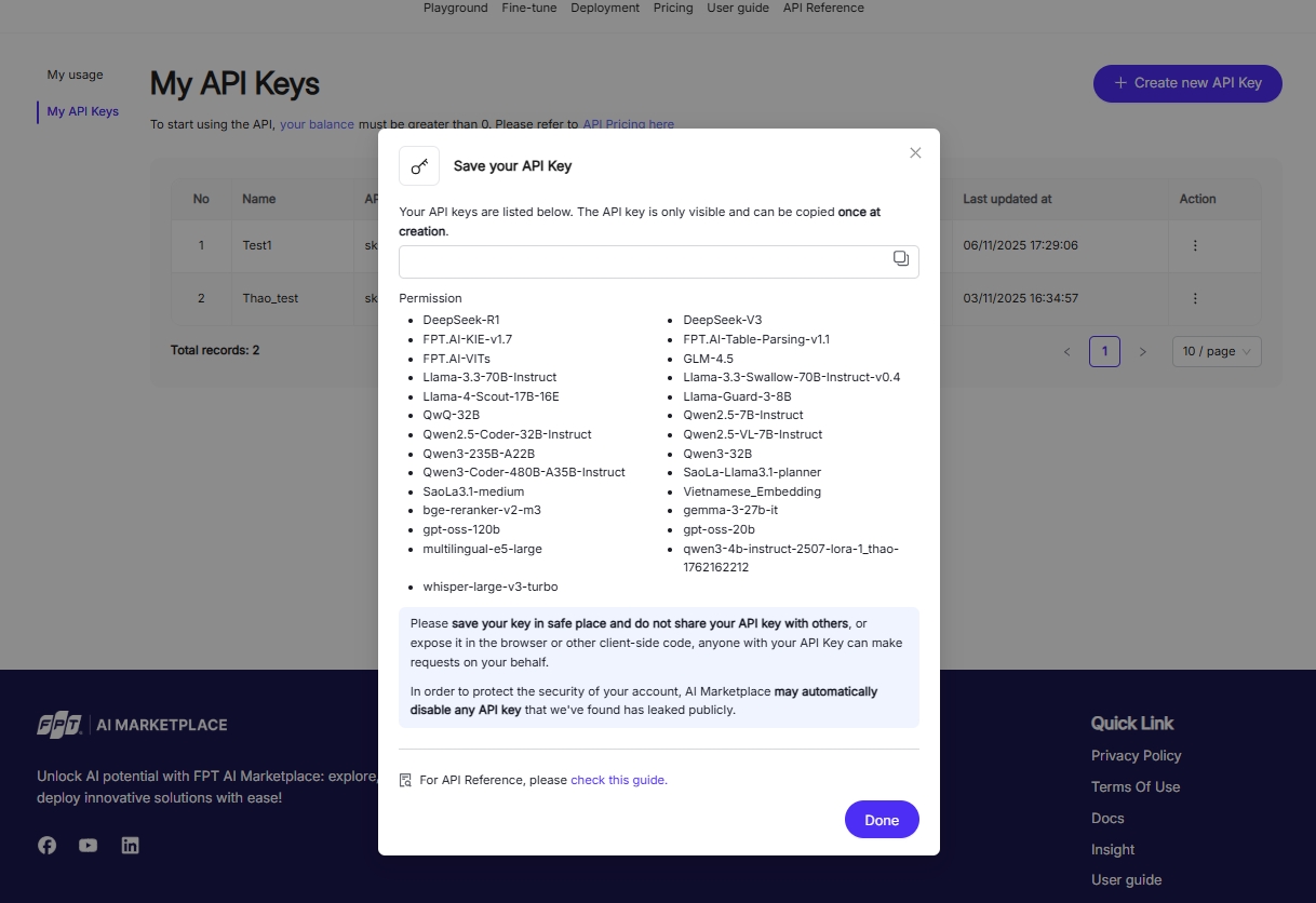 新しいAPIキーが作成されたら、キーをコピーまたは保存してください。 注意:APIキーは作成時に一度だけ表示され、コピーできます。キーは安全な場所に保存し、他人と共有した り、ブラウザやその他のクライアントサイドコードで公開したりしないでください。APIキーを持つ者は誰で も、あなたに代わってリクエストを行うことができます。アカウントのセキュリティを保護するため、AI Marketplaceは、公開されていることが判明したAPIキーを自動的に無効化する 場合があります。