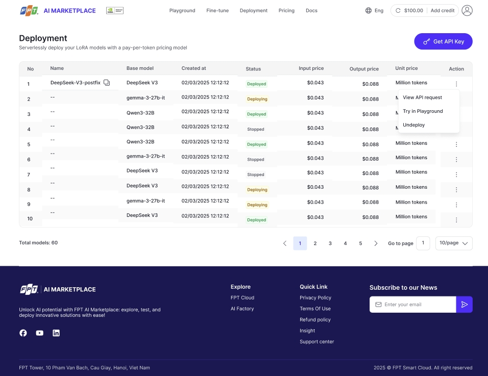 • APIキーを取得–モデルを呼び出すためのキーを取得します。 • APIリクエストの表示–サンプルJSONレスポンスを含むポップアップを開きます。 • プレイグラウンドで試す–UI上で直接モデルをテストします。 • アンデプロイ – デプロイされたモデルの停止(確認が必要)。