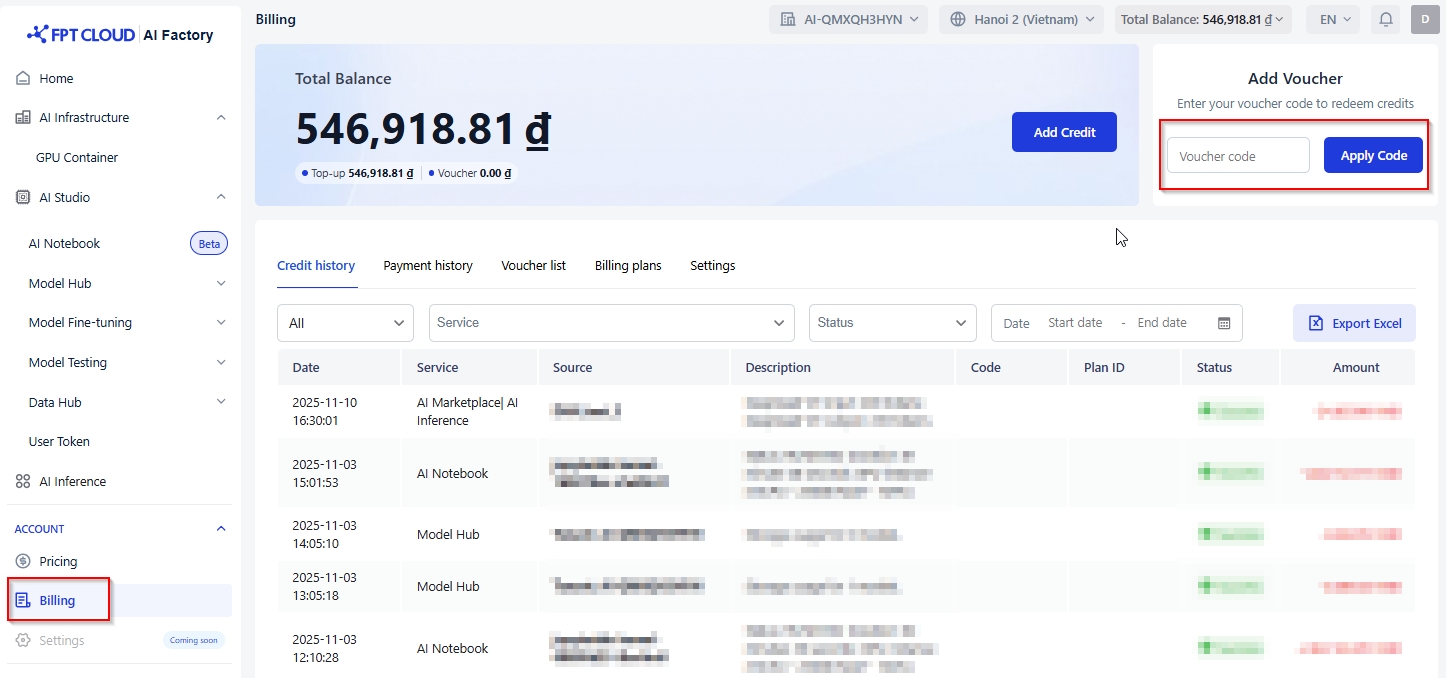 AI Factoryサービスの利用を開始するには、クレジットのチャージまたはバウチャークレジットをご 利用いただけます。