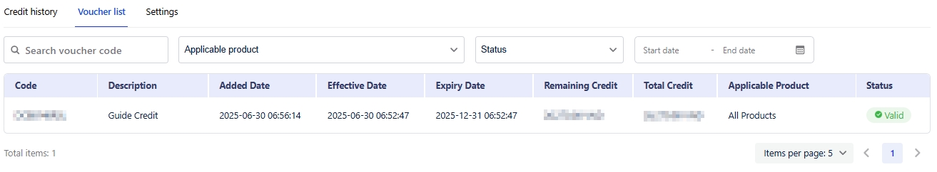 このタブでは、正常に適用されたすべてのクーポンを表示します。ここでは、各クーポンの詳細(残高、金 額、有効期限、適用対象商品、ステータスなど)を追跡でき、ご利用プランの効果的な管理に役立ちます。