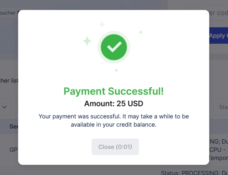 お支払いが完了すると、成功通知を表示するポップアップが表示され、お客様の「総残高」お よび「チャージ残高」が更新されます。.