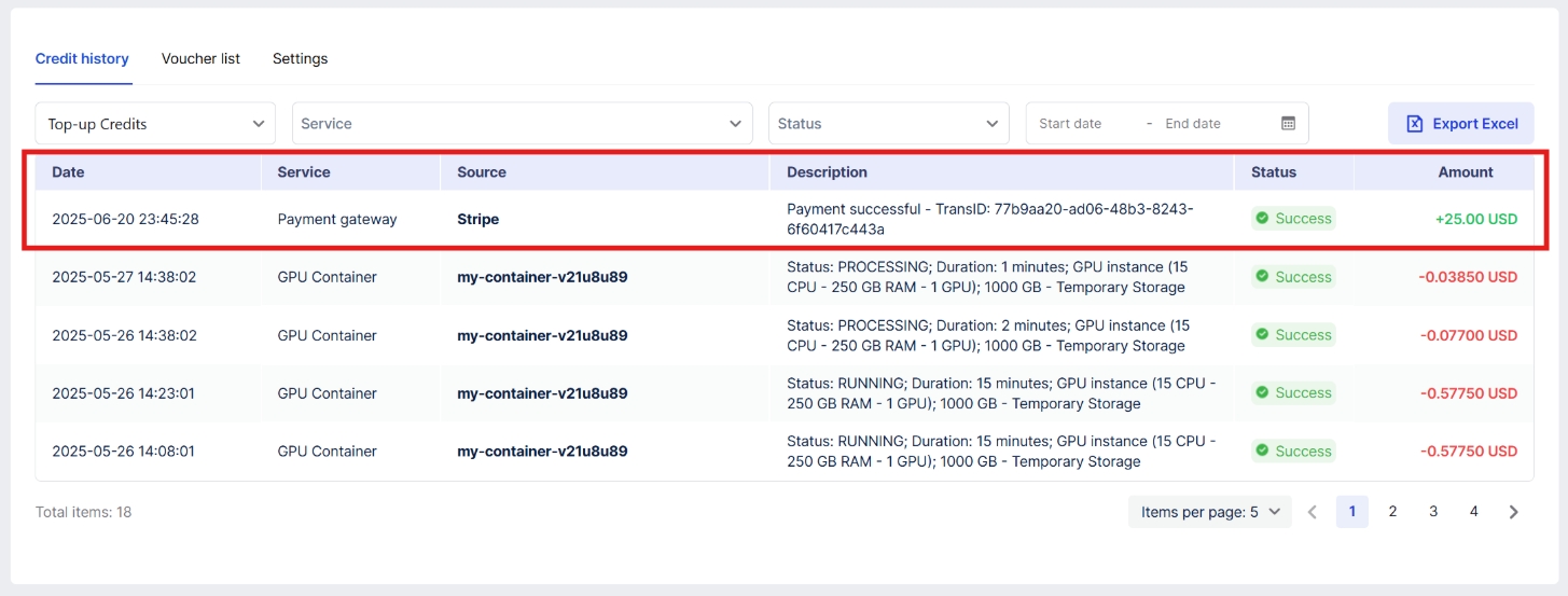クレジット履歴テーブルで、クレジット追加の取引を確認することもできます。