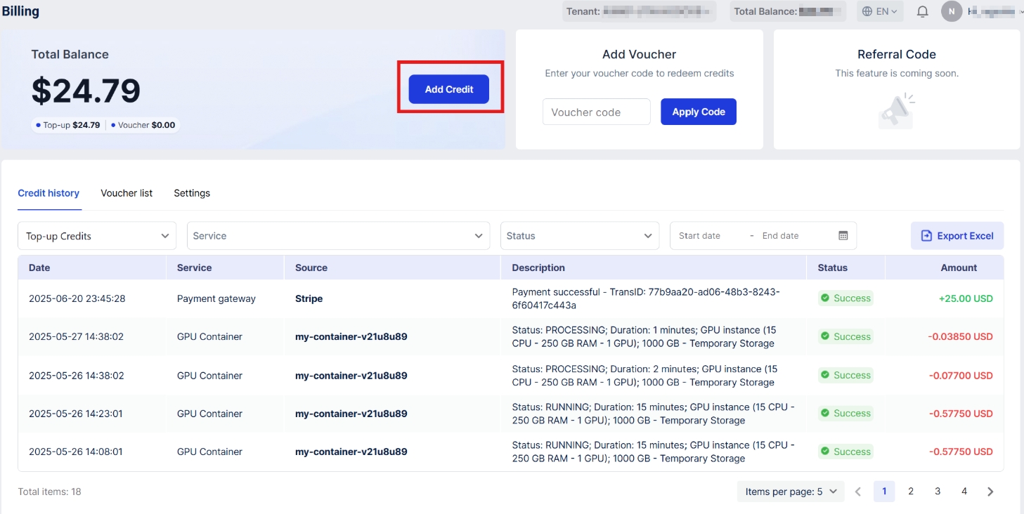 AI Factoryのサービスを利用開始するには、従量課金プランでクレジットを購入する必要があります。 以下の手順に従ってください: