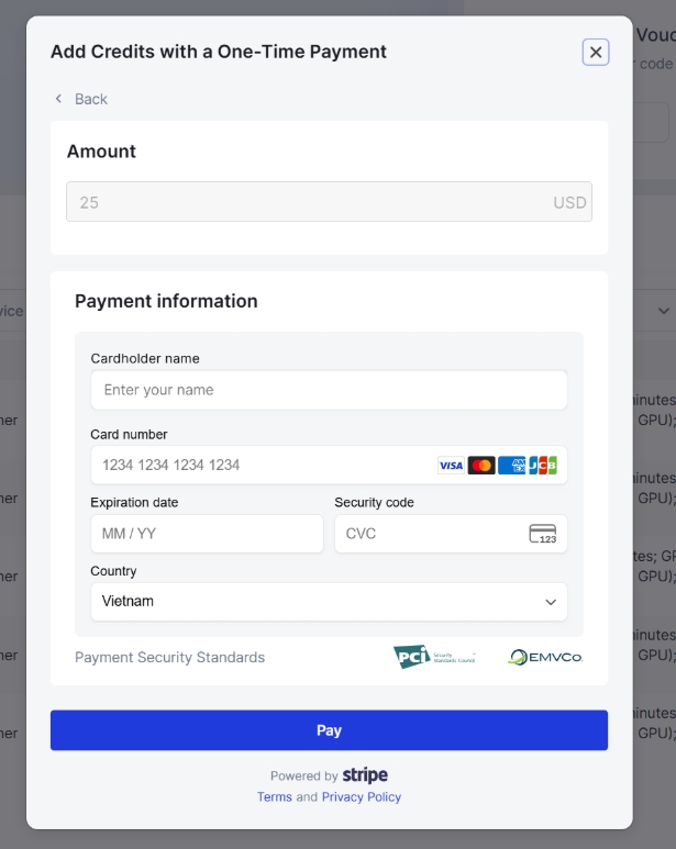 Stripe: :ポップアップウィンドウにカード情報を入力して支払いを進めてください。すべての取引は Stripeによって安全に処理され、FPTはカード情報を保存しません。