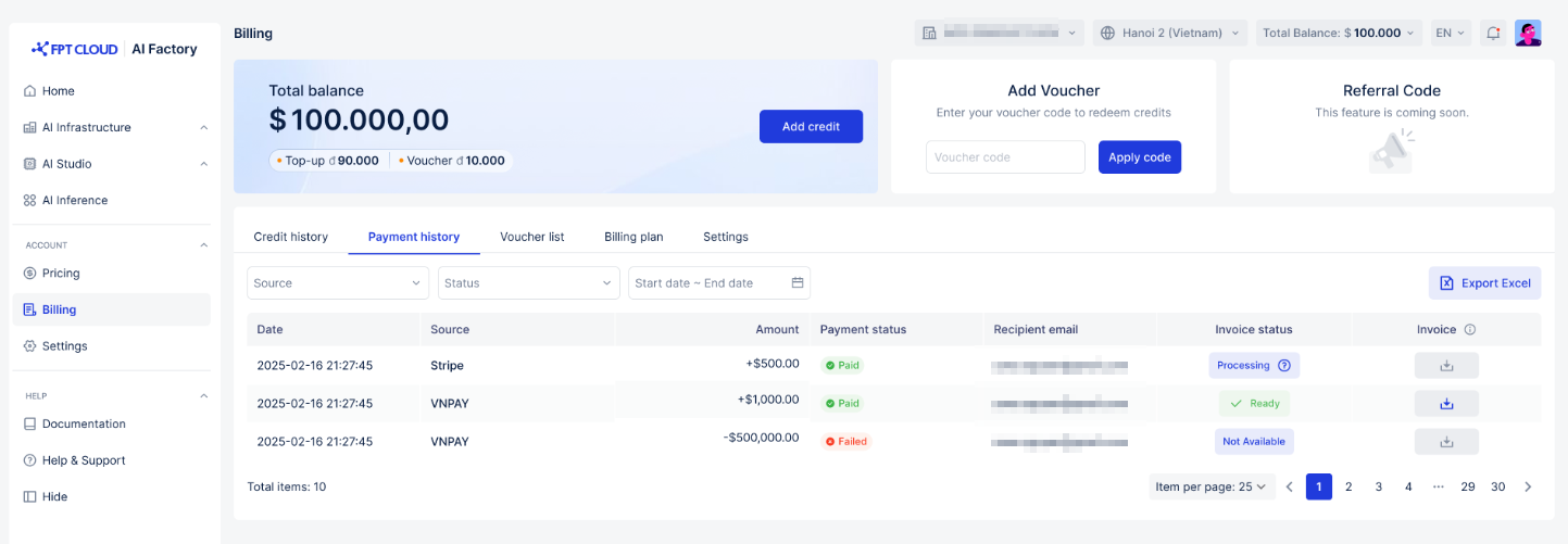 クレジットを追加するたびに、支払い取引が作成されます。 過去のすべての支払いは、FPT AI Factoryで以下のように確認できます: