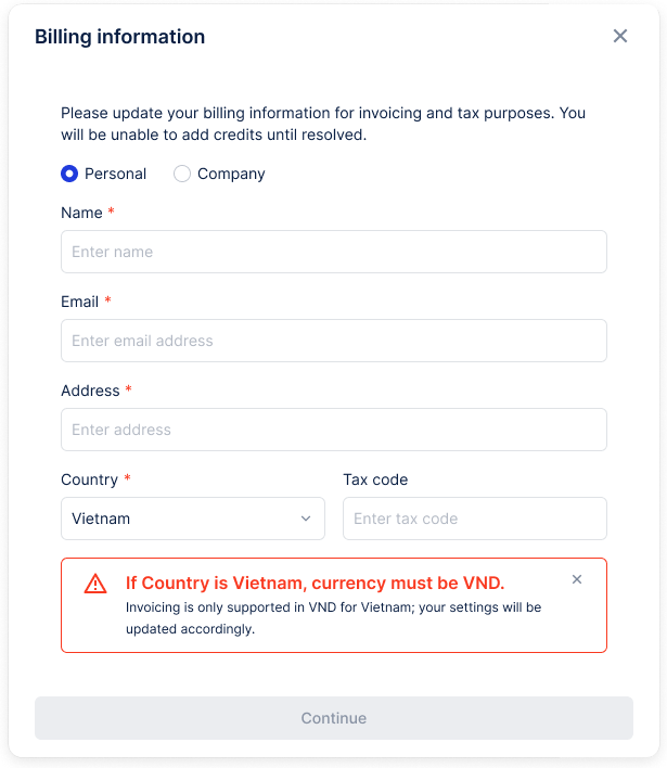 クレジットを追加する前に、請求および税務上の目的で請求情報を提供する必要があります。