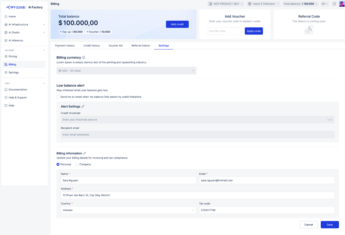 FPT AI Factoryでは2種類のインボイスが利用可能です: