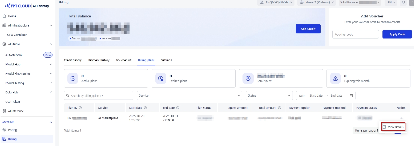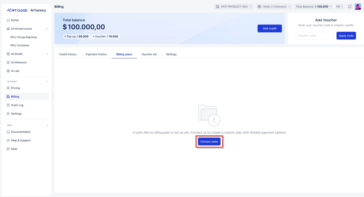 AI Factoryにアクセス → 請求 → 請求プランに移動し、「営業担当に連絡」をクリックしてオン ラインで相談リクエストを送信してください。