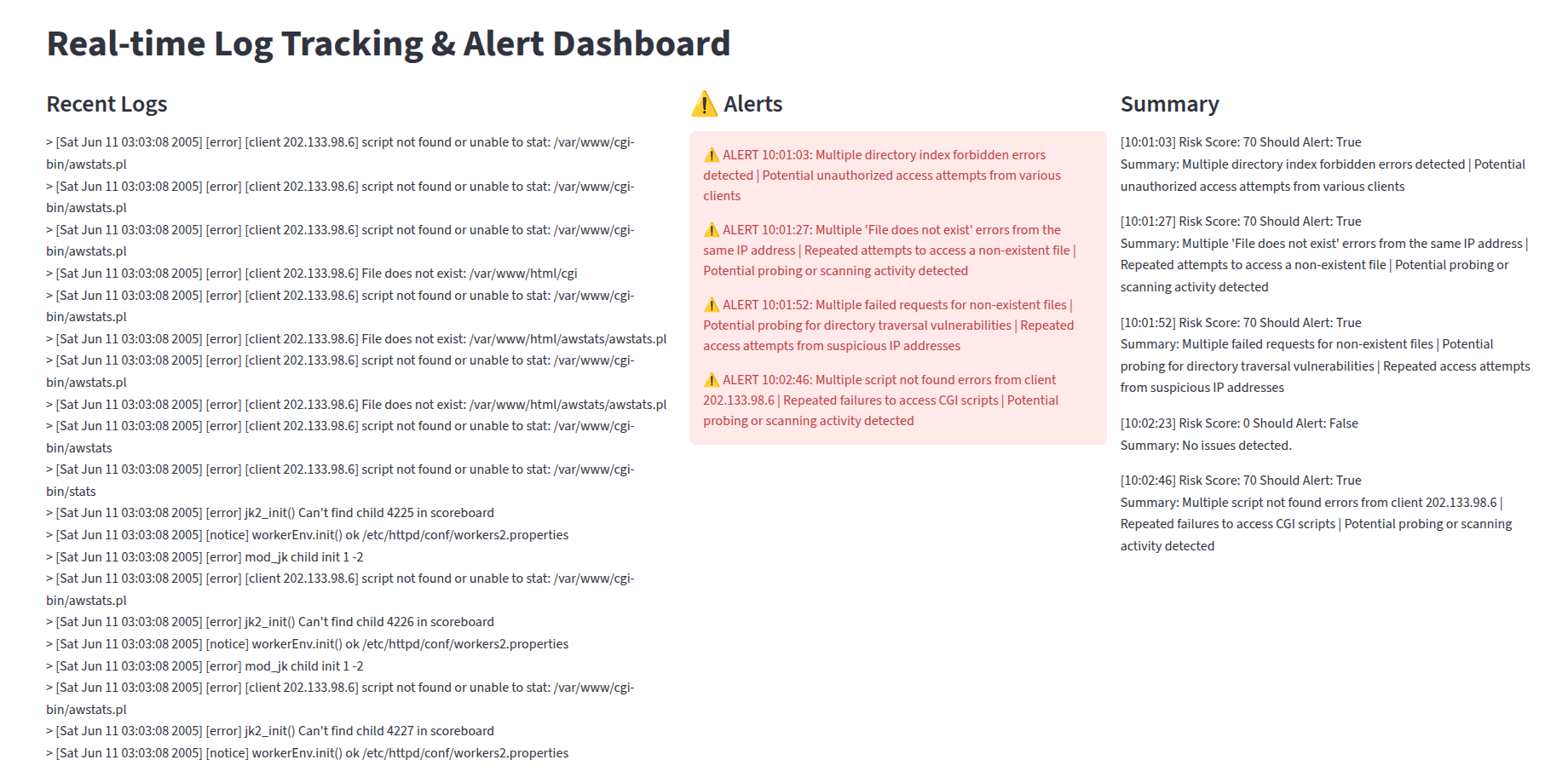 プロジェクトの最終要素はStreamlitダッシュボードであり、リアルタイムログ分析を可視化するユーザーフレンドリーなインターフェースを提供します。