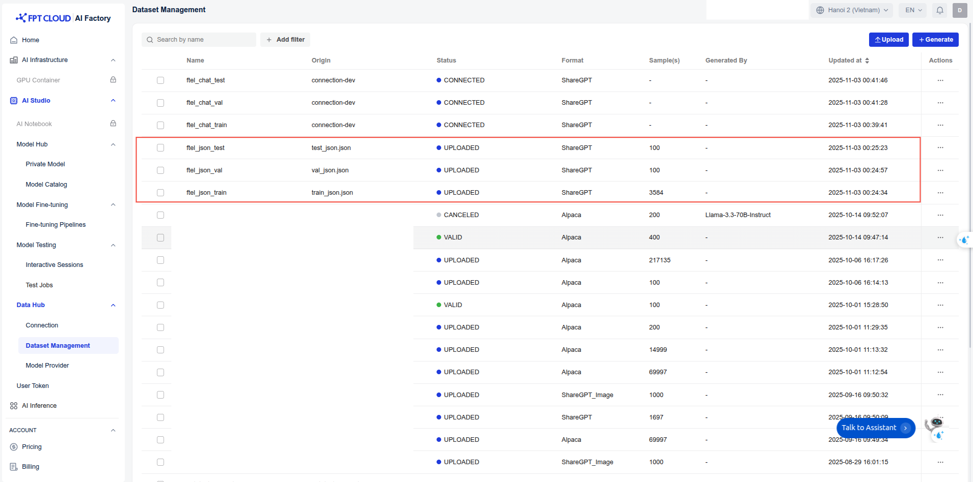 データは管理のためにData Hubにアップロードされます。データセット管理でデータセットを作成し、そこにデータセットをアップロードします。