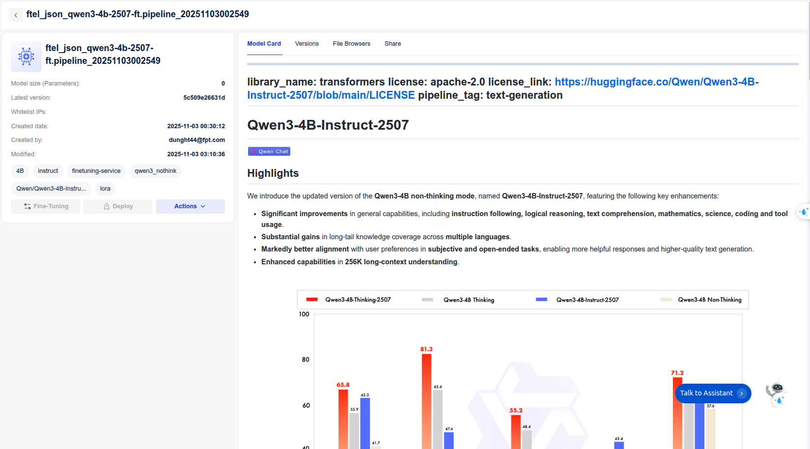 モデルトレーニング:FPT AI Studioプラットフォームのモデル微調整機能を用いて、合成データセット上でQwen/Qwen3-4B-Instruct-2507モデルの微調整を実施。このステップでは、Data Hubでトレーニングデータを容易に管理し、Model Hubでトレーニング済みモデルの異なるバージョンを管理します。