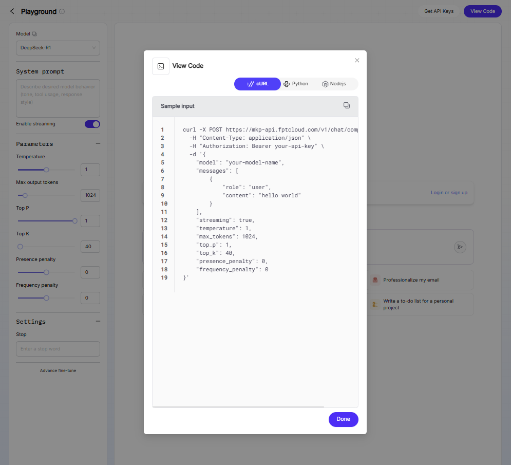 コードを表示をクリックすると、ポップアップが開き、cURL、Python、Node.js のサンプルコー ドスニペットとリクエストに対する応答例が表示されます。