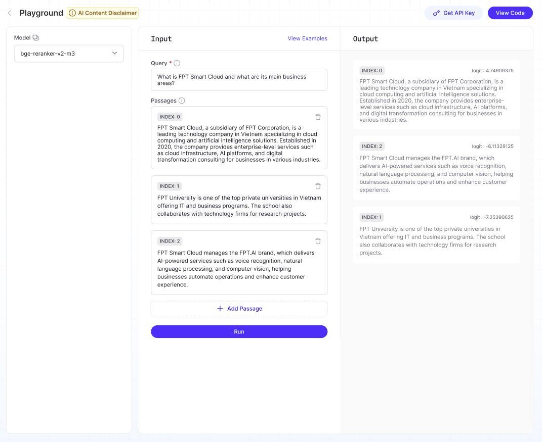 実行をクリック→モデルは各文章に対してロジットスコアを計算し、それが与えられたクエリにどれほど 関連しているかを示します。
