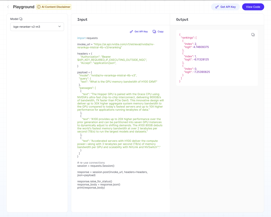 モデルドロップダウンから、再ランク付けモデルを選択します。例: bge-reranker-v2-m3.