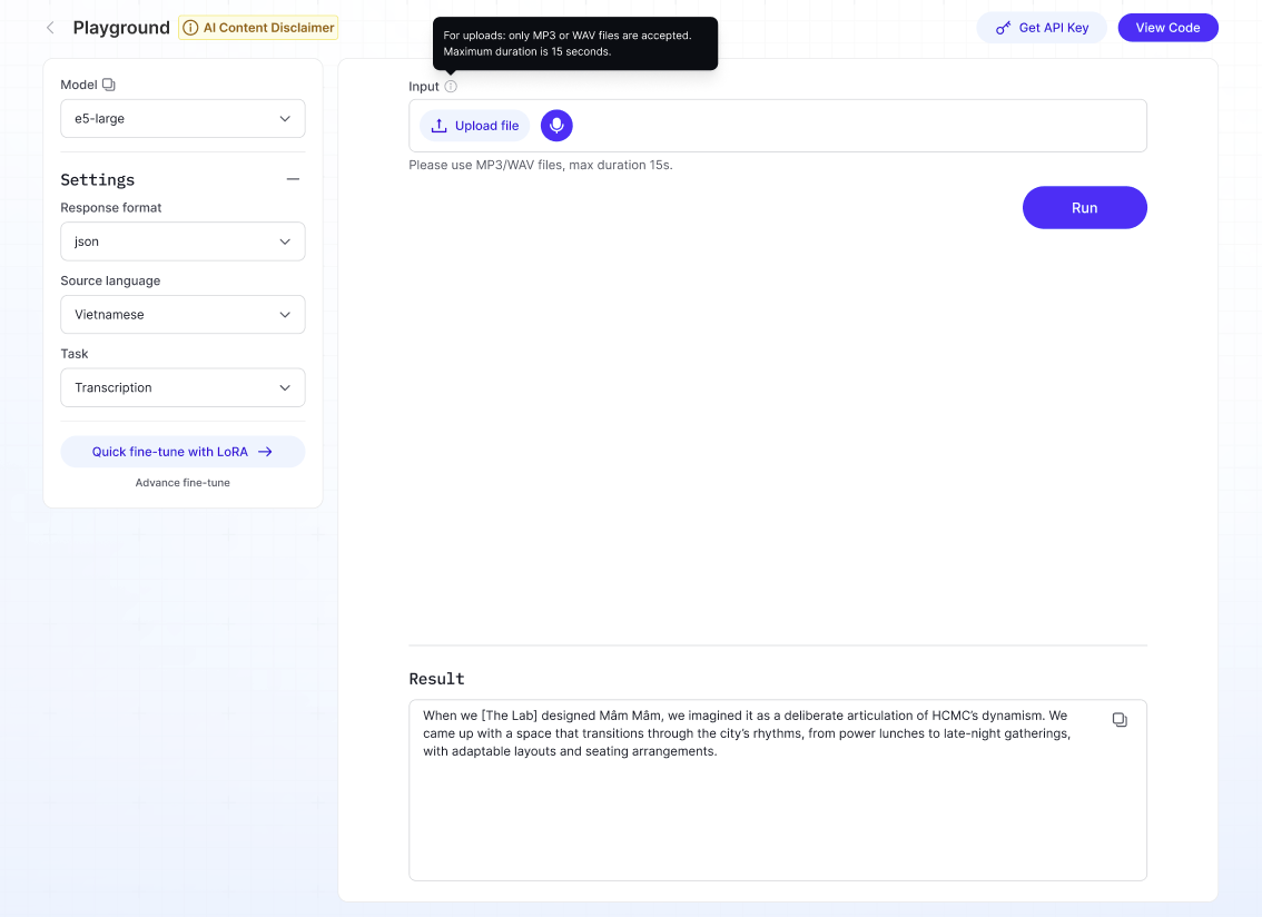 実行をクリック →文字起こしまたは翻訳されたテキストが結果セクションに表示されます。