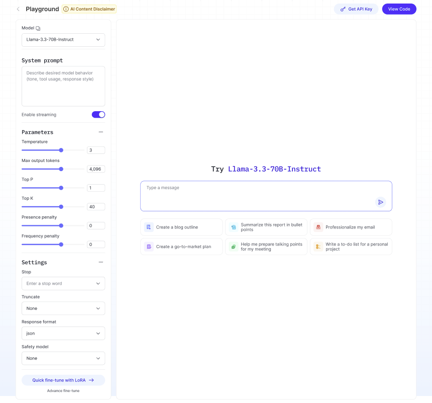 温度、最大出力トークン数、上位P、上位K、ペナルティ – 創造性、長さ、ランダム性を 微調整します。