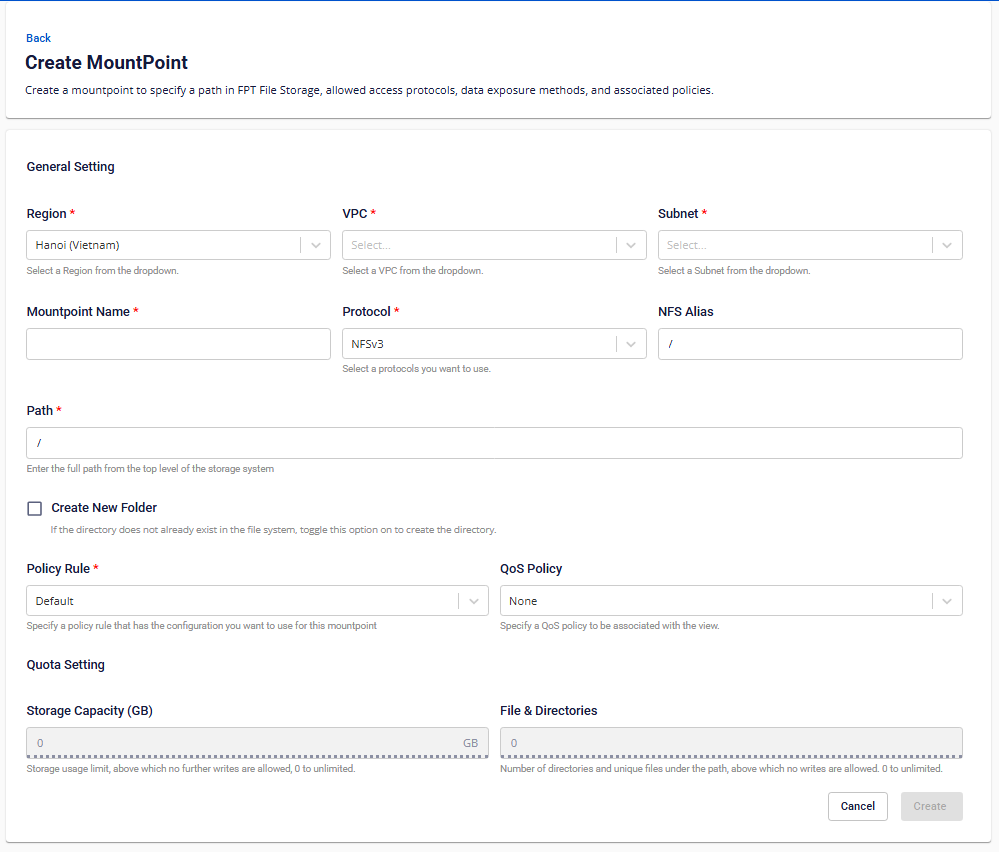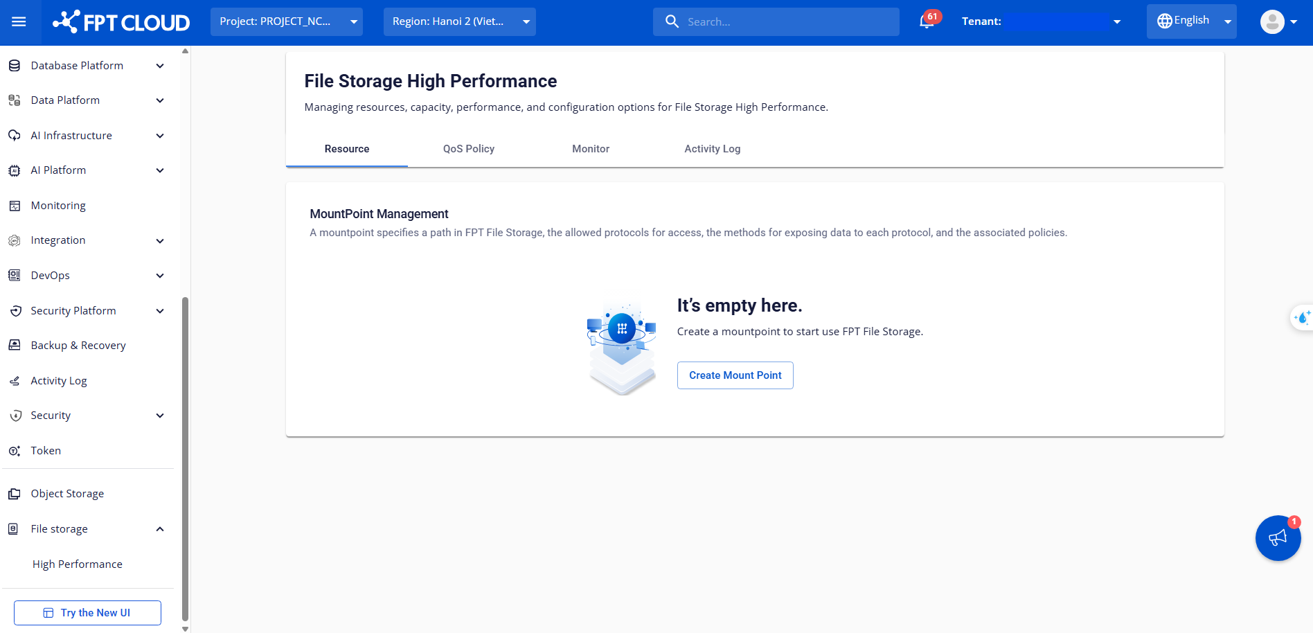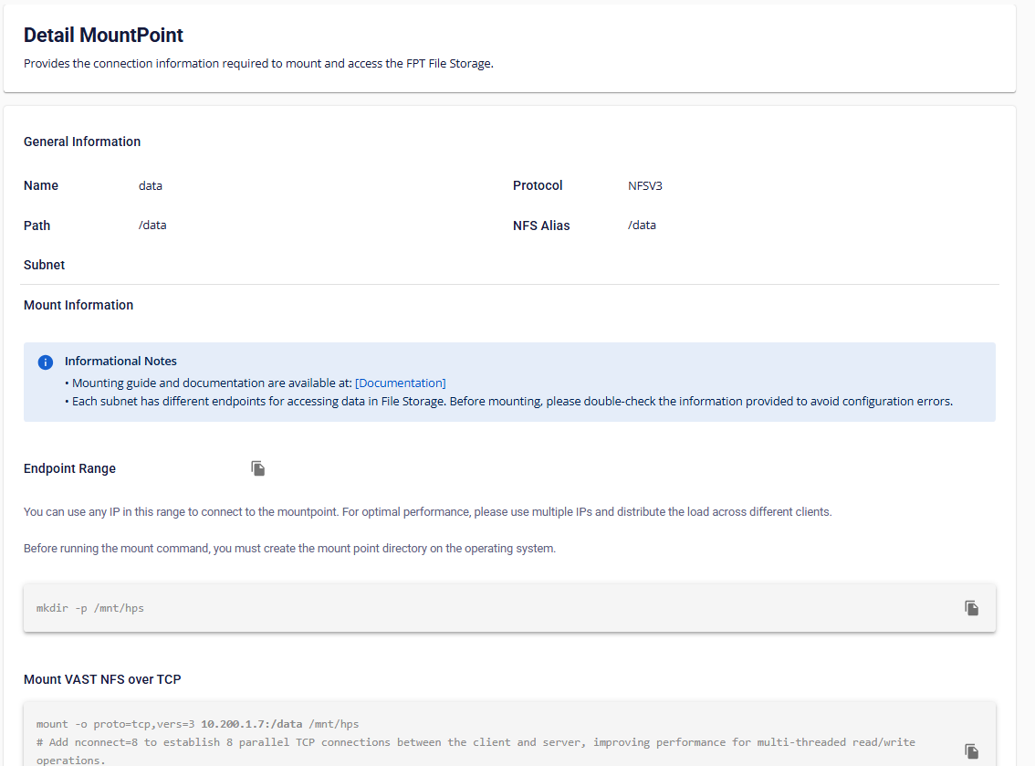 FPT Cloudコンソールにおけるマウントポイント管理機能は、現在ベトナム(ハノイ2)リージョンでのみサポートされており、Metal Cloudサービス(ベアメタルGPUサーバー)でのみ利用可能です。