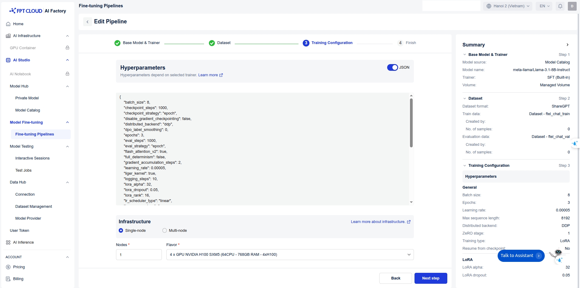 At FPT AI Studio, we charge $2.31 per GPU-hour. The table above shows the estimated cost of running this tutorial. Importantly, we only charge for actual GPU usage time and time spent on tasks such as model downloading, data downloading, data tokenization, and pushing data to the Model Hub is not included in the calculation.