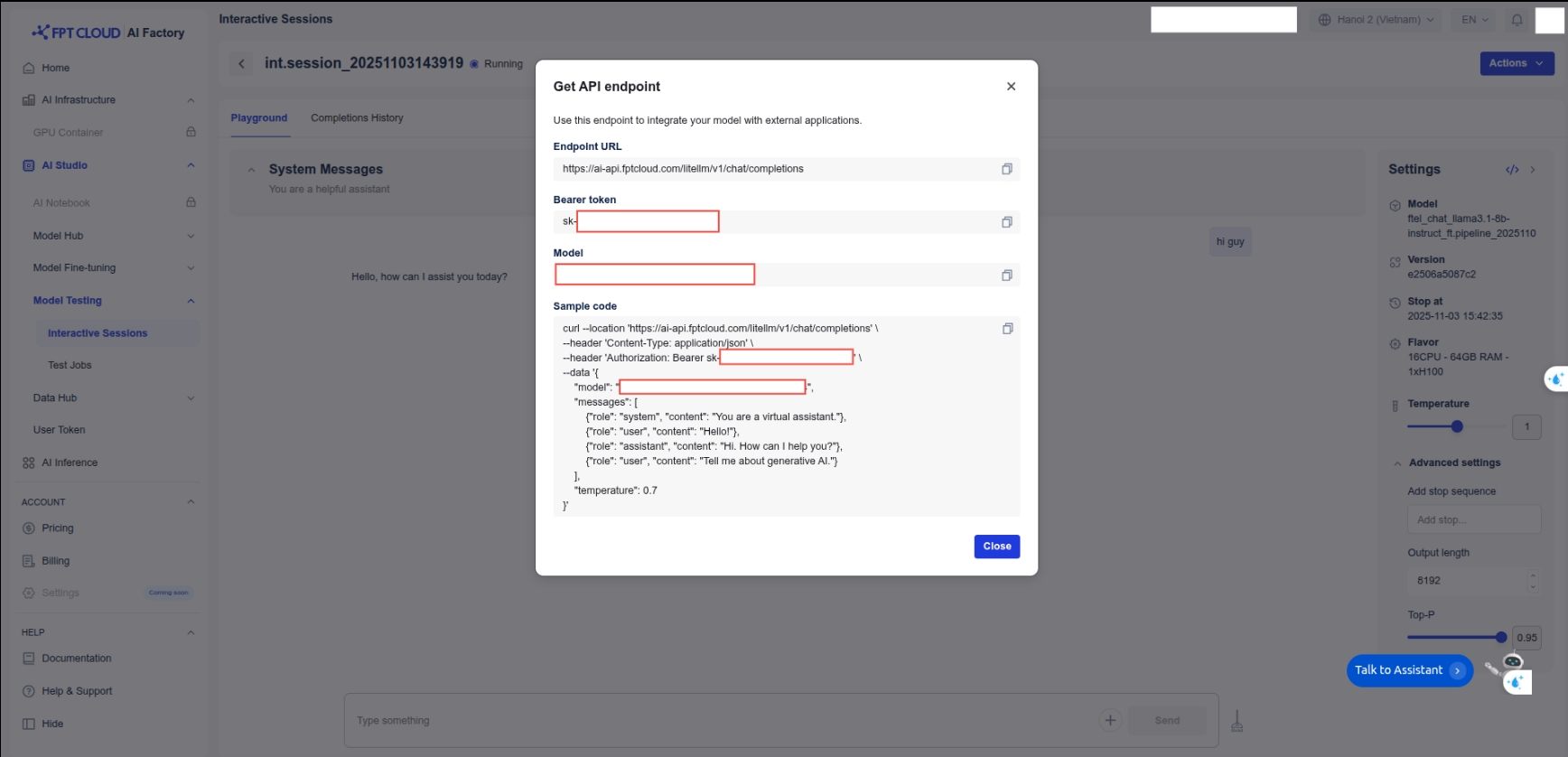 The fine-tuned model was deployed on FPT AI Studio's Interactive Session. This made the model accessible via an API endpoint, allowing our Streamlit application to send log data and receive analysis results in real-time. In addition, we can chat directly on the Interactive Session interface.