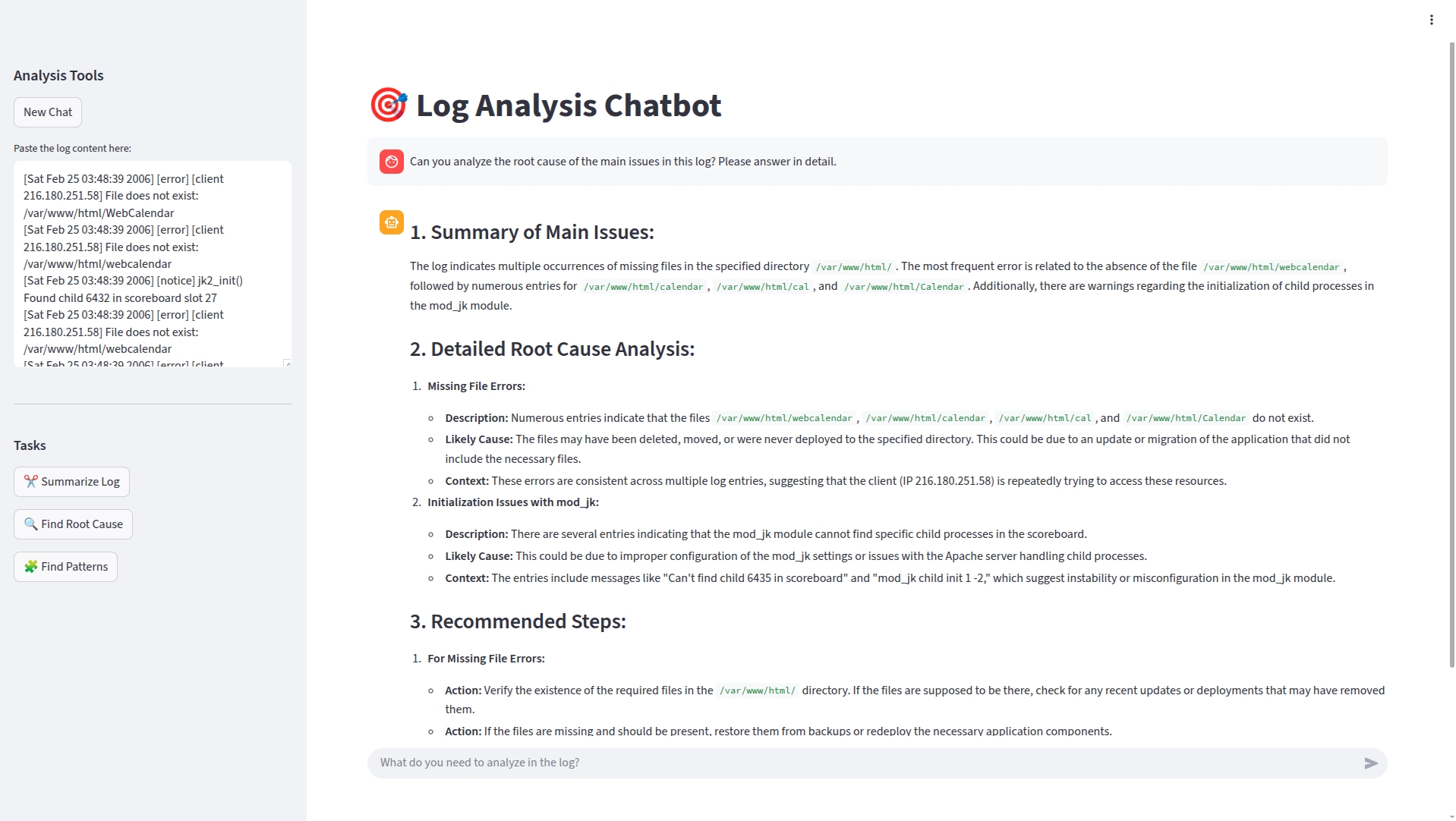 Paste your log data into the “Paste the log content here” box in the sidebar. (You should paste 50–150 lines of log.)