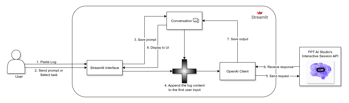 When the user triggers a task or sends a question, the app composes a structured request containing both the user’s prompt and the provided log content. This is then sent to the fine-tuned Llama-3.1-8B-Instruct model deployed via FPT AI Studio API, which processes the input and streams back results in real time.