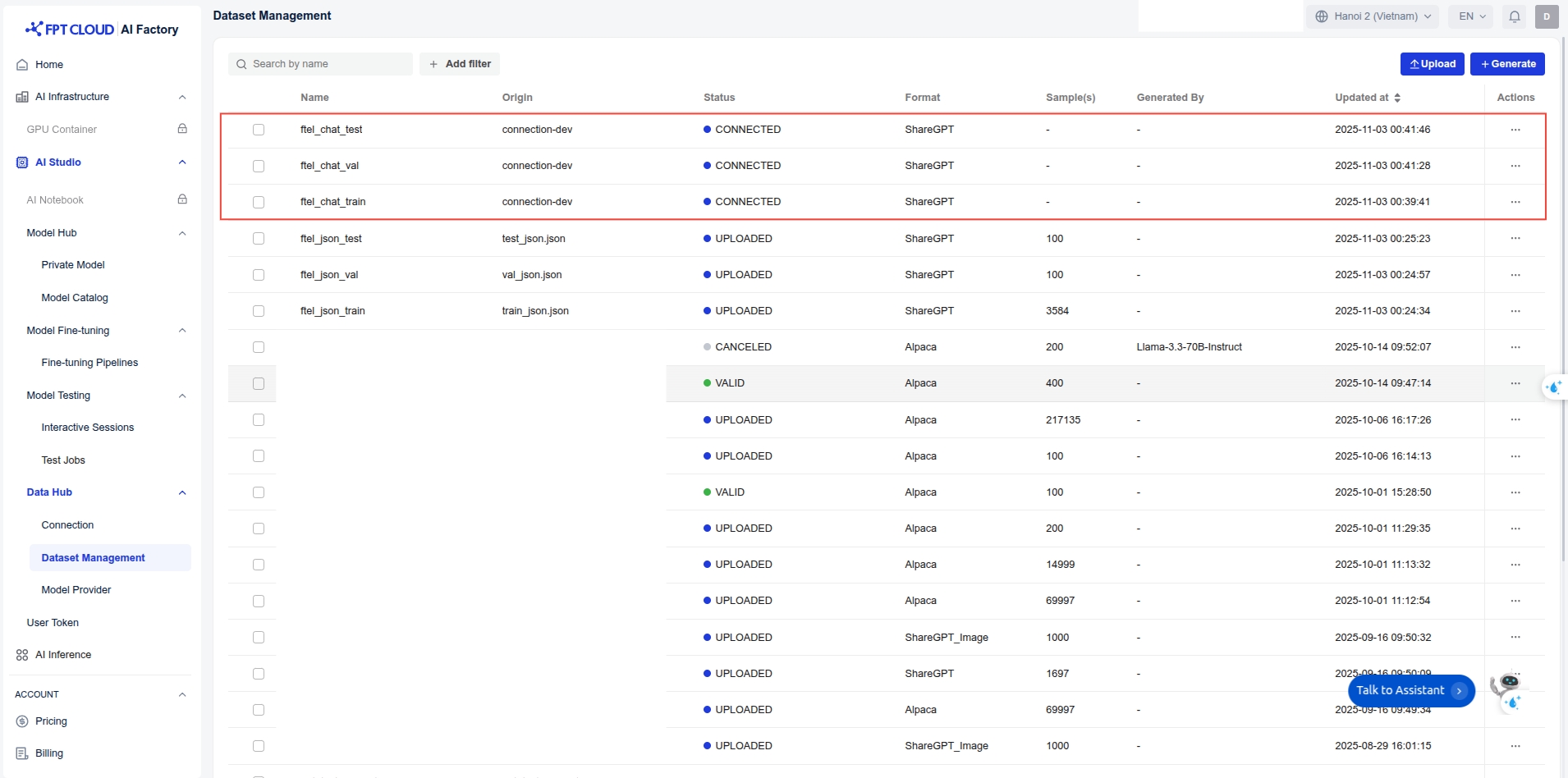 Use Data Hub and Model Hub for dataset and model management.
