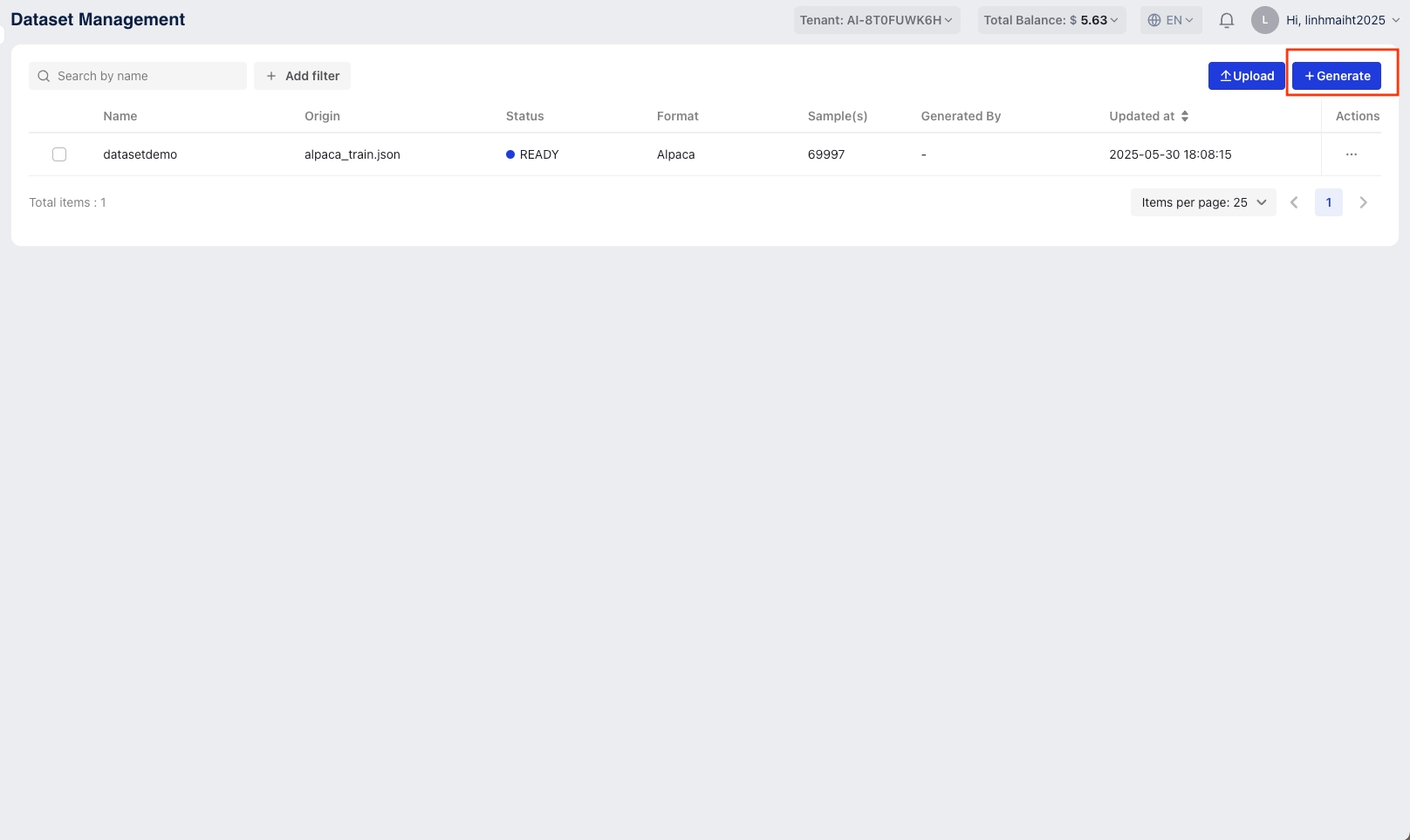 Access the Data Hub service, navigate to Dataset Management menu and click the "Generate Dataset" button