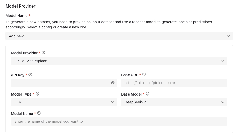 https://mkp-api.fptcloud.com/Model Type: Select the type of model, which defines the AI model’s function. Currently only support LLM - Large Language Model