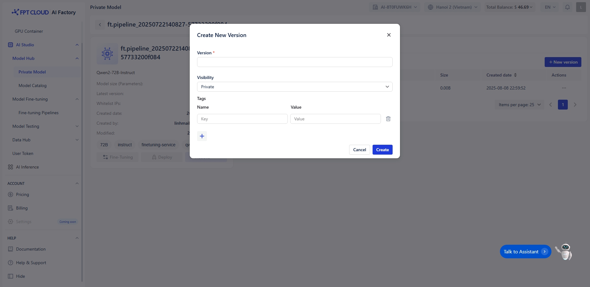 Note: The version name can include a-z, A-Z, numbers, "-", "_", ".", and can be up to 20 characters. The version name must be unique for each model.
