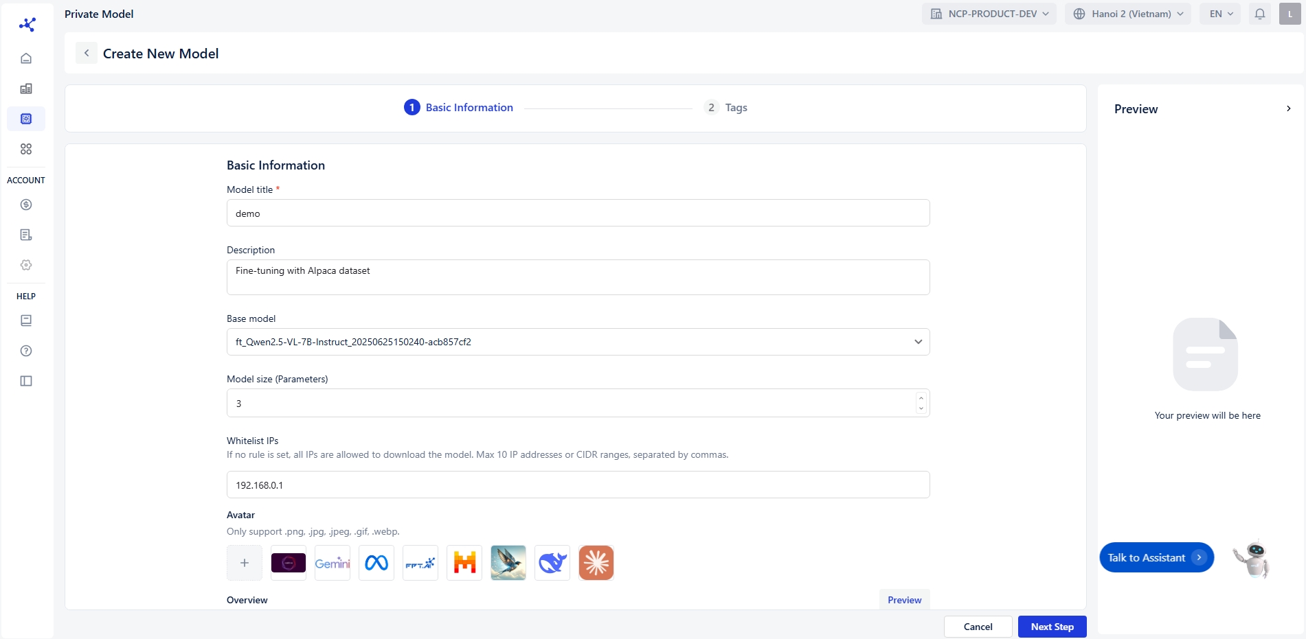 Update Basic Information: Change the title, description, base model, size, avatar, and whitelist IPs.
