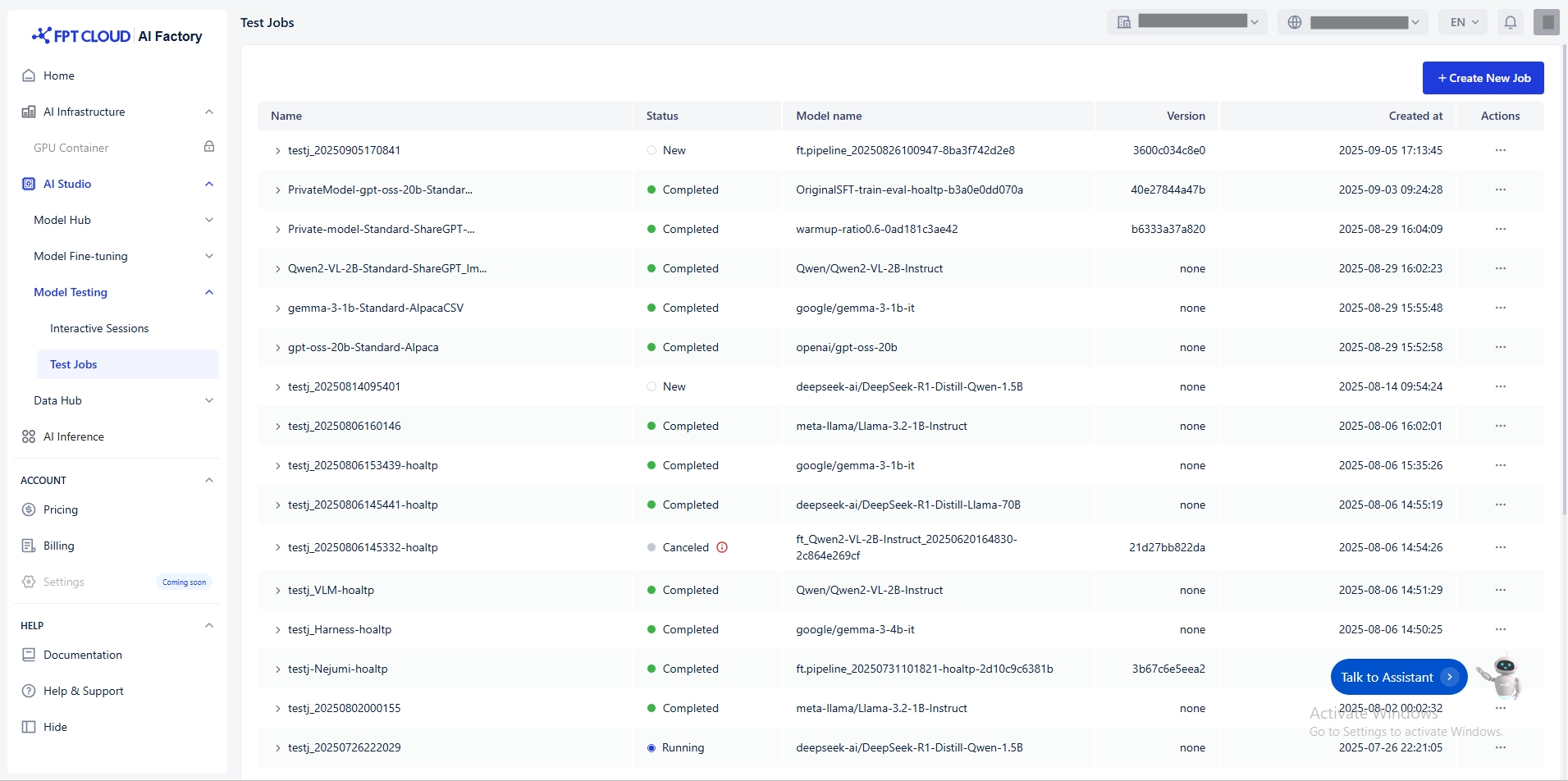Model Testing - Test Jobs is a core feature of the FPT AI Factory Portal that provides a structured and automated way to evaluate fine-tuned AI models. Unlike Interactive Sessions - which focus on real-time, manual interactions, Test Jobs are designed for large-scale, repeatable testing using predefined datasets.