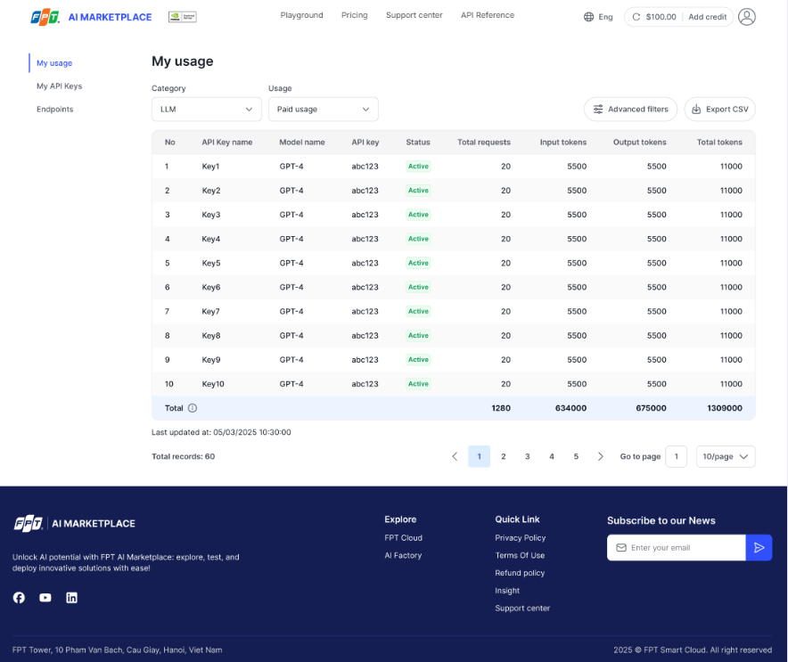 To check your usage including Input tokens, Output tokens, Total Usage for each Model and API Key, please go to My Account > My usage