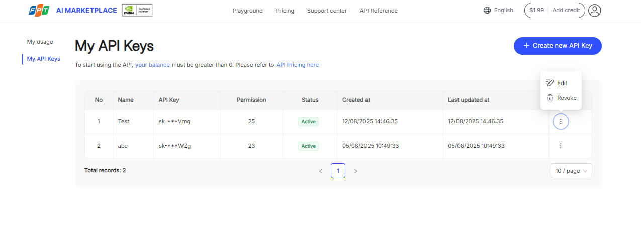 You can edit Name and Permission of the API Key. To edit an API Key, please follow these steps: