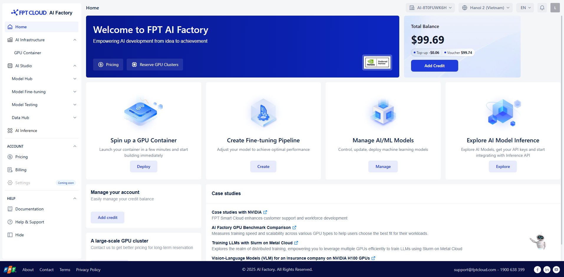 After signing in, you will be redirected to the AI Factory Dashboard, where you can: