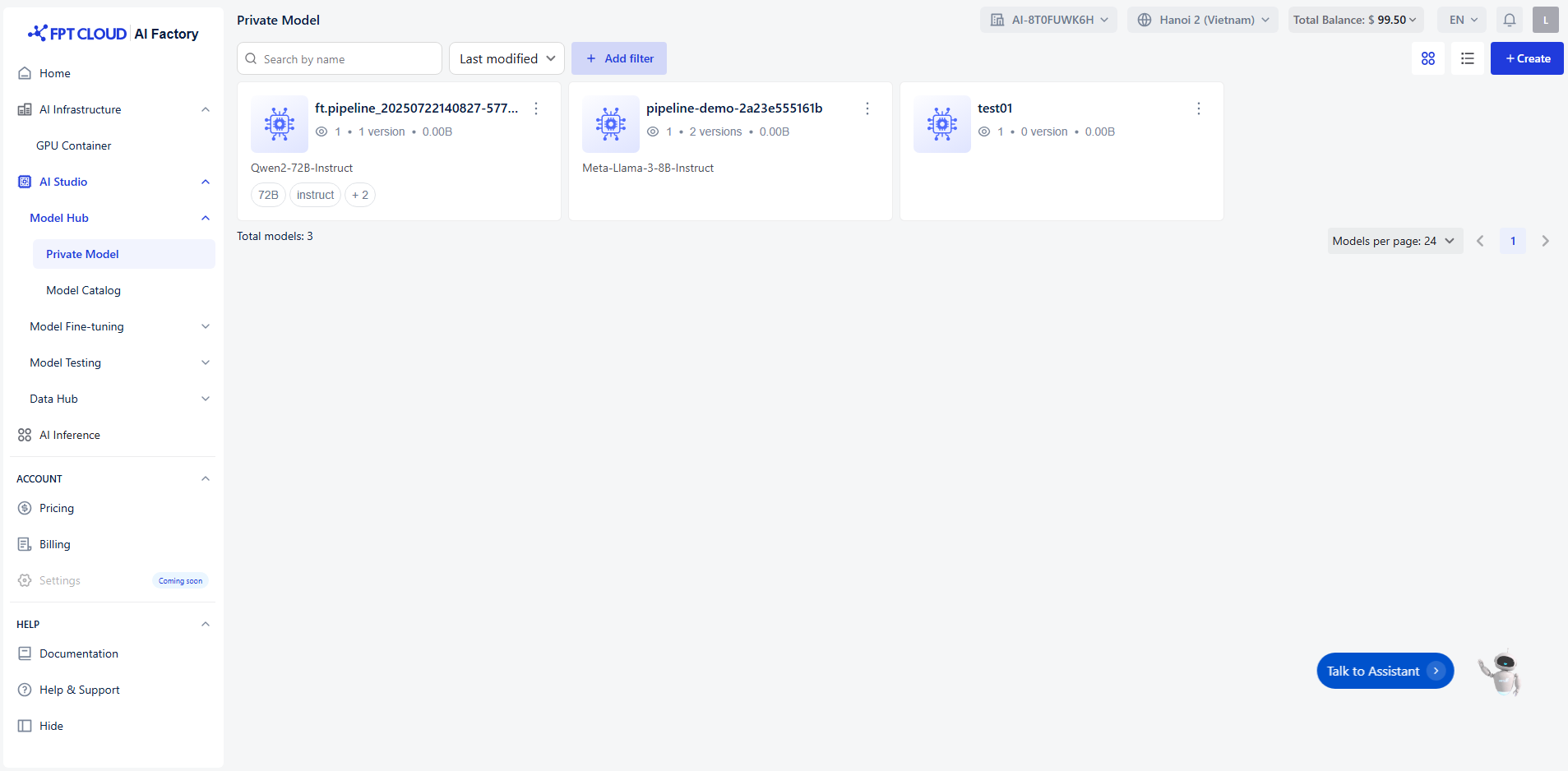 Create Model allows users to build a private AI model by customizing its basic settings, metadata, and access controls. On the Model Hub service screen, click the Create button to go to the creation page.