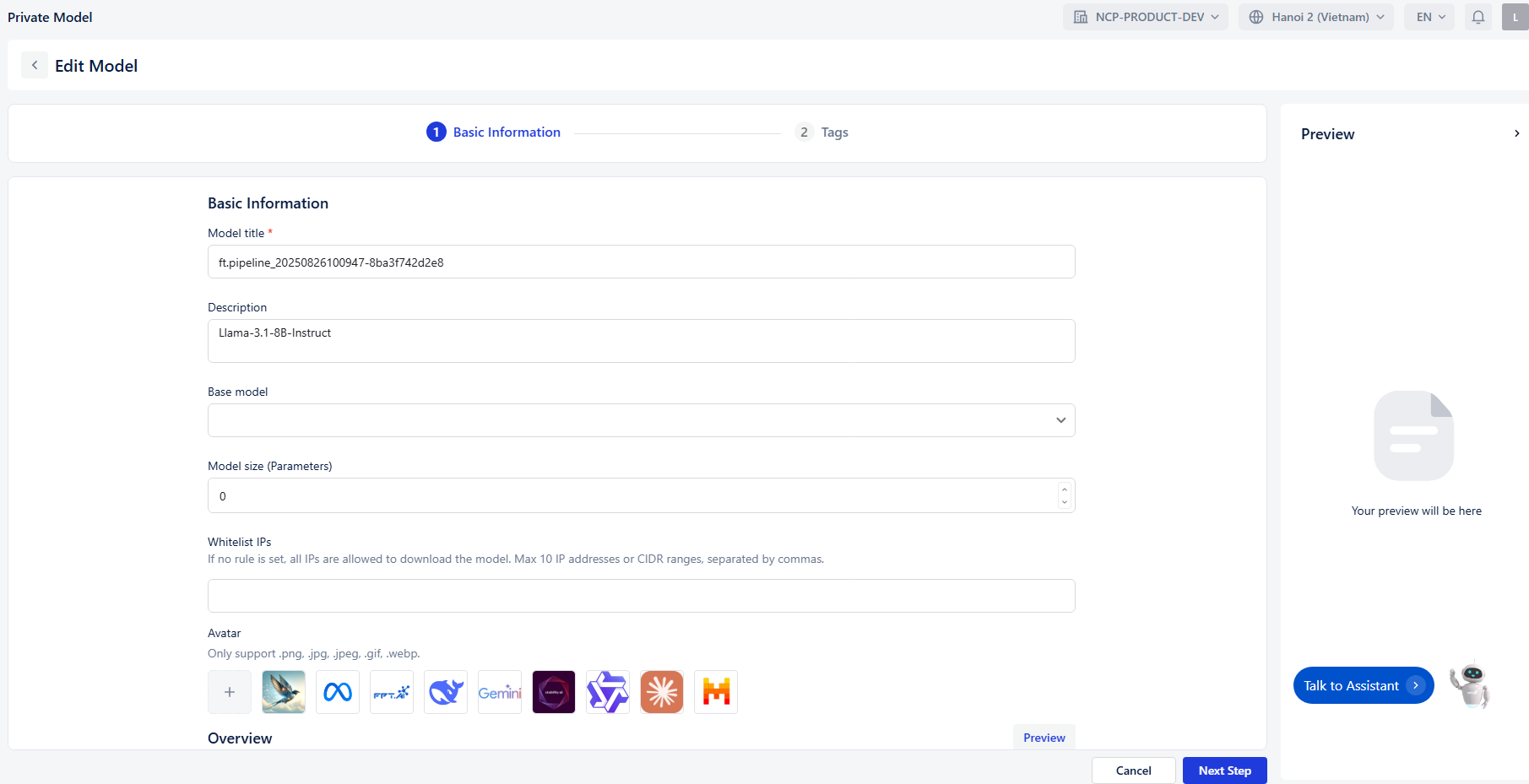 Update Basic Information: Change the title, description, base model, size, avatar, and whitelist IPs.